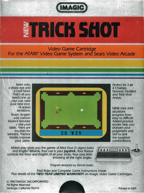 Trick Shot Boxes 1) ©1982, silver box, illustration same as picture label, no product #, Printed in USA, plastic tray inside, “New” written to the left of the title Front
