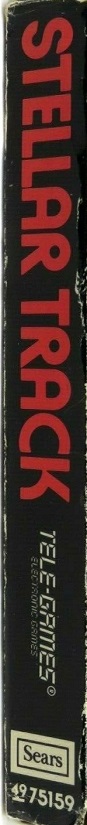 Stellar Track Boxes 1) ©1981, black standard style box with red letters, illustration same as picture label cart, warranty info on back, #49-75159 on side, standard flap style box Front Back