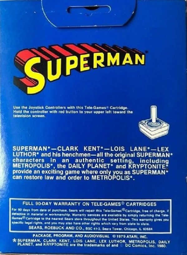 Superman Boxes 1) ©1980, blue box with red and yellow Superman logo, warranty info on back, 2 line copyright notice on back, #49-75152 on side, standard flap style box Front Back